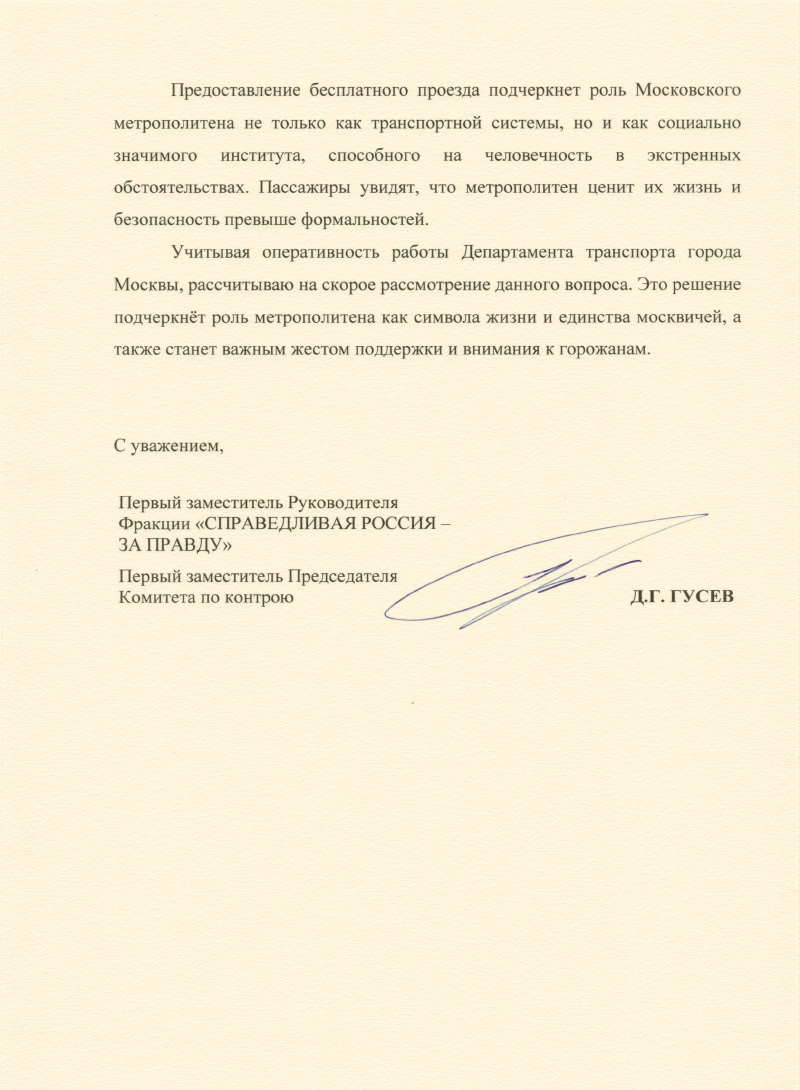 "Такой жест покажет, что метро – это не только транспорт, но и место, где ценят жизнь и человечность. История уже вызывает восторг у москвичей. Поэтому ждём новостей от Департамента транспорта и, возможно, скоро у этой трогательной истории появится еще более счастливое продолжение. Надеюсь на оперативное решение", – подчеркнул Дмитрий Гусев.