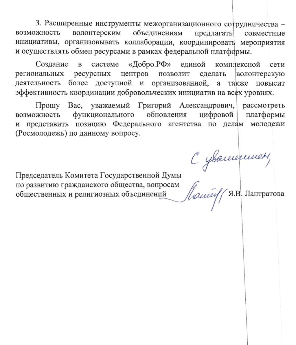 Первый заместитель руководителя фракции "СПРАВЕДЛИВАЯ РОССИЯ – ЗА ПРАВДУ" в Госдуме Яна Лантратова направила письмо главе Росмолодёжи Григорию Гурову с предложением расширить региональный функционал платформы "Добро.рф".