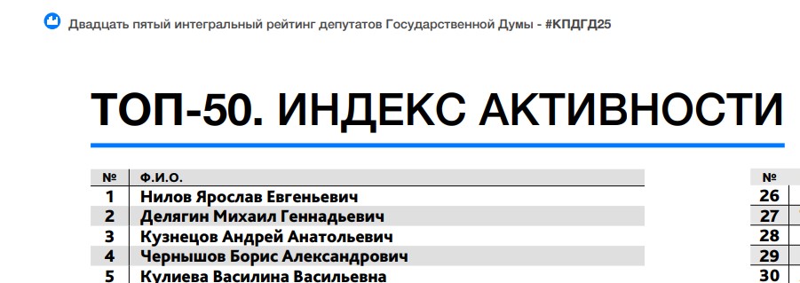 Он составлен по итогам работы парламентариев с апреля по июль 2025 года. Место в рейтинге зависит от того, сколько законопроектов внёс депутат за отчётный период, сколько раз выступил на заседаниях, в каком количестве рабочих мероприятий принял участие. Чем активнее парламентарий исполняет свои непосредственные обязанности, тем выше его позиция.