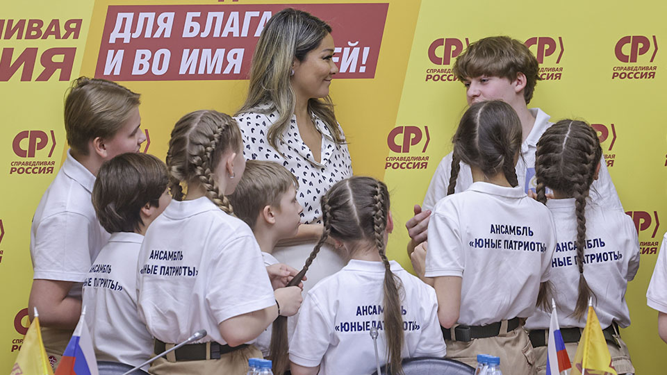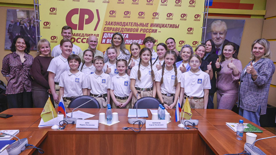 Председатель Партии СПРАВЕДЛИВАЯ РОССИЯ, руководитель партийной фракции в Госдуме Сергей Миронов и депутат фракции СР Марина Ким провели встречу с ансамблем "Юные патриоты", его руководителем Сергеем Минькиным и родителями юных артистов.
